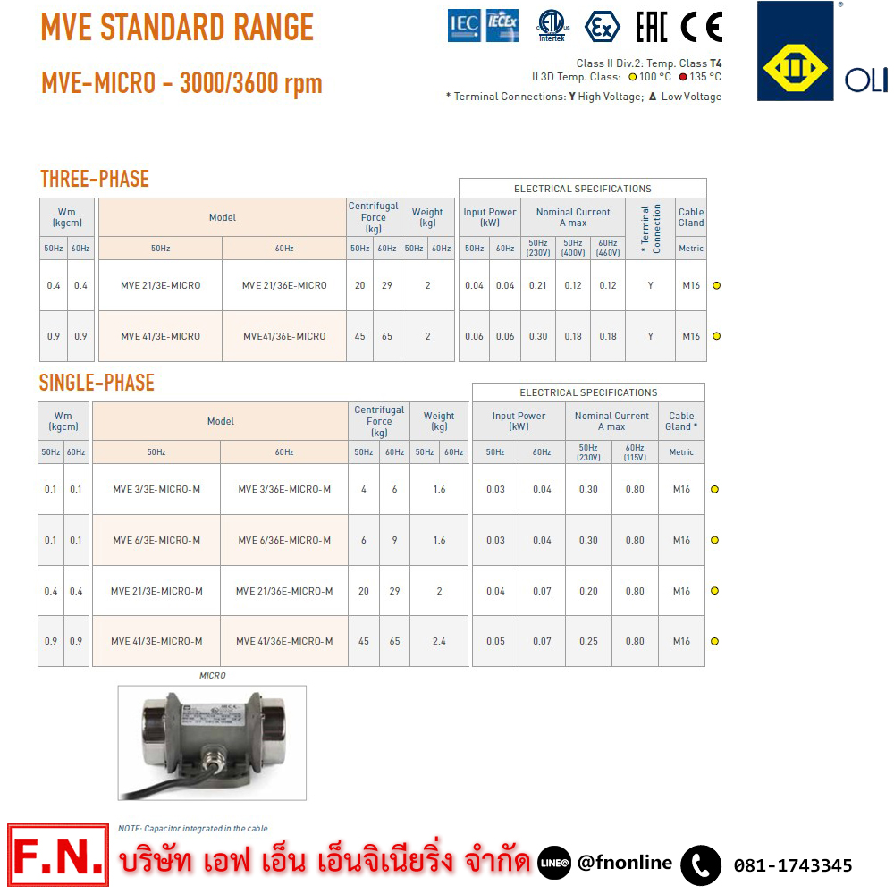 OLI MVE-3/3E-MICRO-M มอเตอร์เขย่า 0.03KW,220V ความเร็วรอบเขย่า 3000 RPM
