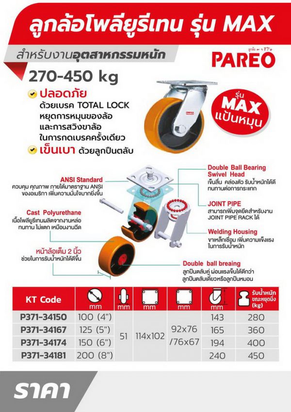PAREO ล้อโพลียูรีเทน รุ่น MAX แป้นหมุน ขนาด 125 มิลลิเมตร (5 นิ้ว) รับน้ำหนักได้ 350-400 กก. มีแรงยืดหยุ่นสูง ไม่ทำให้พื้นเป็นรอย