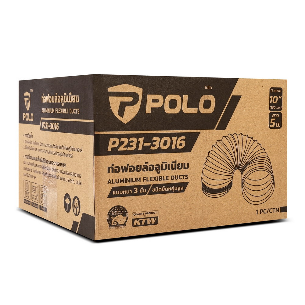 POLO ท่อลมระบายอากาศอเนกประสงค์ ขนาด 10 นิ้ว (250 มม.) ยาว 5 เมตร แบบหนา 3 ชั้น ชนิดยืดหยุ่นสูง ป้องกันการติดไฟ น้ำหนักเบา สามารถปรับทิศทางได้ตามต้องการ ง่ายต่อการติดตั้ง