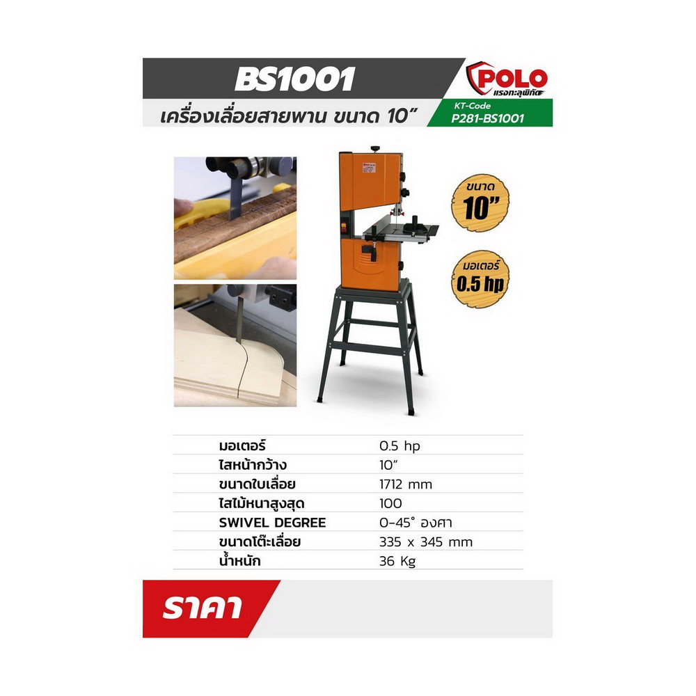 POLO แท่นเลื่อยสายพาน 370 วัตต์ 1/2 แรงม้า ขนาด 10 นิ้ว รุ่น BS1001 ตัดสูงสุด 100 มม. ความเร็วใบมีด 725 เมตร/นาที ความเร็วรอบ 1,450 รอบ/นาที
