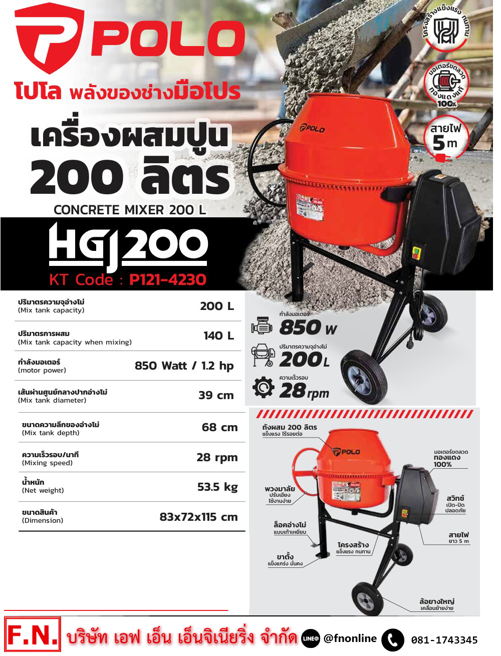 POLO เครื่องผสมปูน เครื่องโม่ผสมปูน รุ่น HGJ200 กำลังมอเตอร์ 850 วัตต์ (1.2 แรงม้า) ปริมาตรความจุอ่างโม่ 200 ลิตร ความเร็วรอบ 28 รอบ/นาที