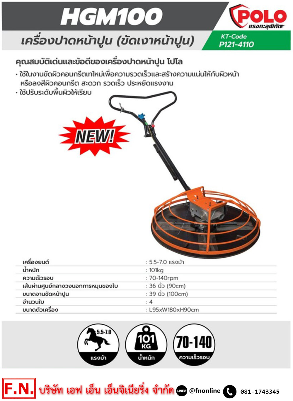 POLO เครื่องปาดหน้าปูน + ถาด (ไม่รวมเครื่อง) เครื่องยนต์ 5.5 – 7.0 แรงม้า รุ่น HGM100 เส้นผ่านศูนย์กลาง 36 นิ้ว ความเร็วรอบ 70 – 140 รอบ/นาที