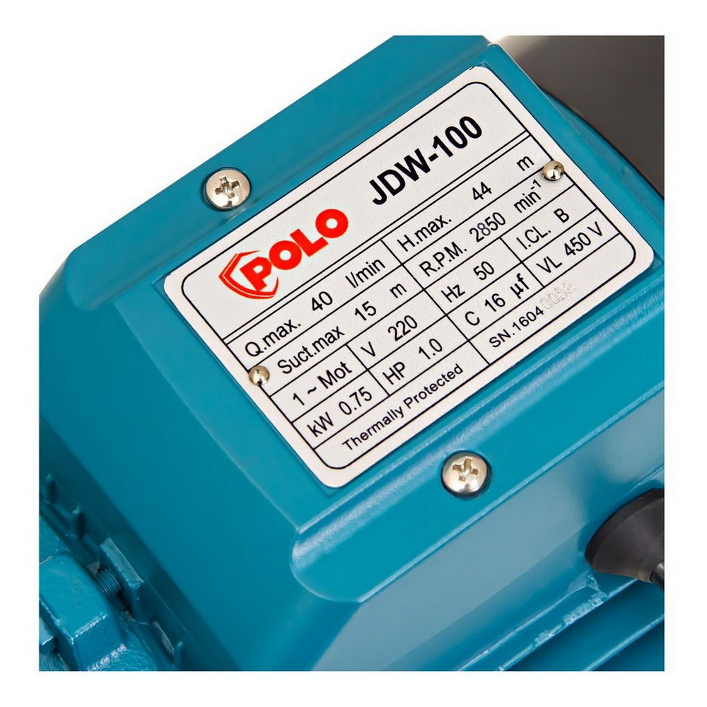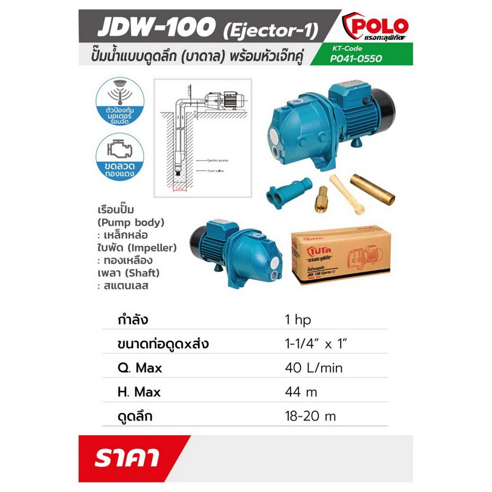 POLO ปั๊มหอยโข่ง สำหรับบ่อบาดาล 1 แรงม้า ดูดลึก 15 ม. รุ่น JDW-100 (EJECTOR-1) ท่อดูด 1-1/4 นิ้ว ท่อส่ง 1 นิ้ว ส่งสูง 35 – 44 ม. ปริมาณน้ำ 25 – 40 ลิตร/นาที ขนาดบ่อ 4 นิ้ว