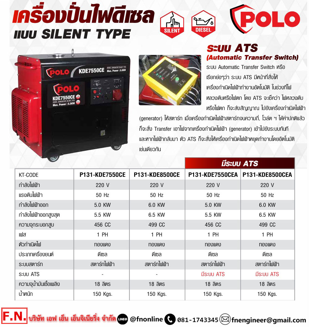 POLO KDE8500CEA เครื่องปั่นไฟดีเซล 6.5 KW ระบบ ATS สตาร์ทไฟฟ้า