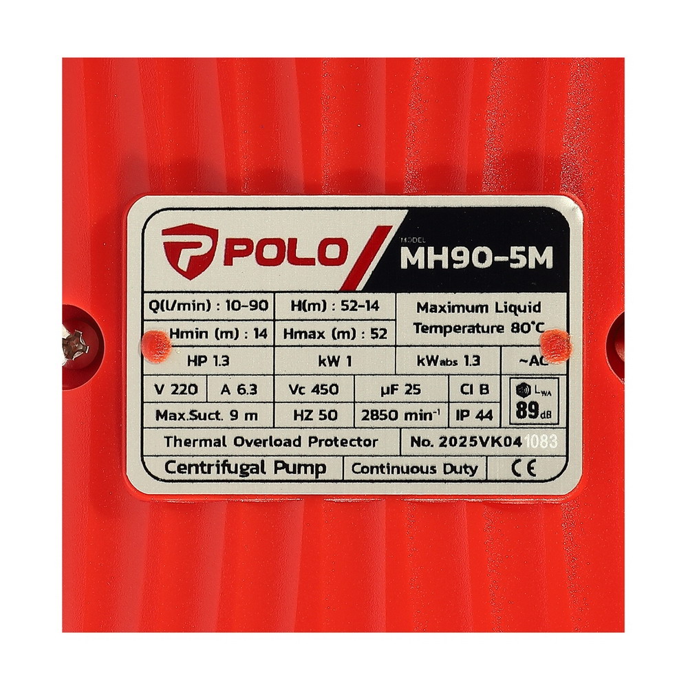 POLO ปั๊มน้ำหลายใบพัดแนวนอน 1.0 กิโลวัตต์ 5 ใบพัด ส่งสูง 14 – 52 ม. รุ่น MH90-5M ปริมาณน้ำสูงสุด 10 – 90 ลิตร/นาที ขนาดท่อ 1 นิ้ว ใช้สำหรับน้ำสะอาดทั่วไป