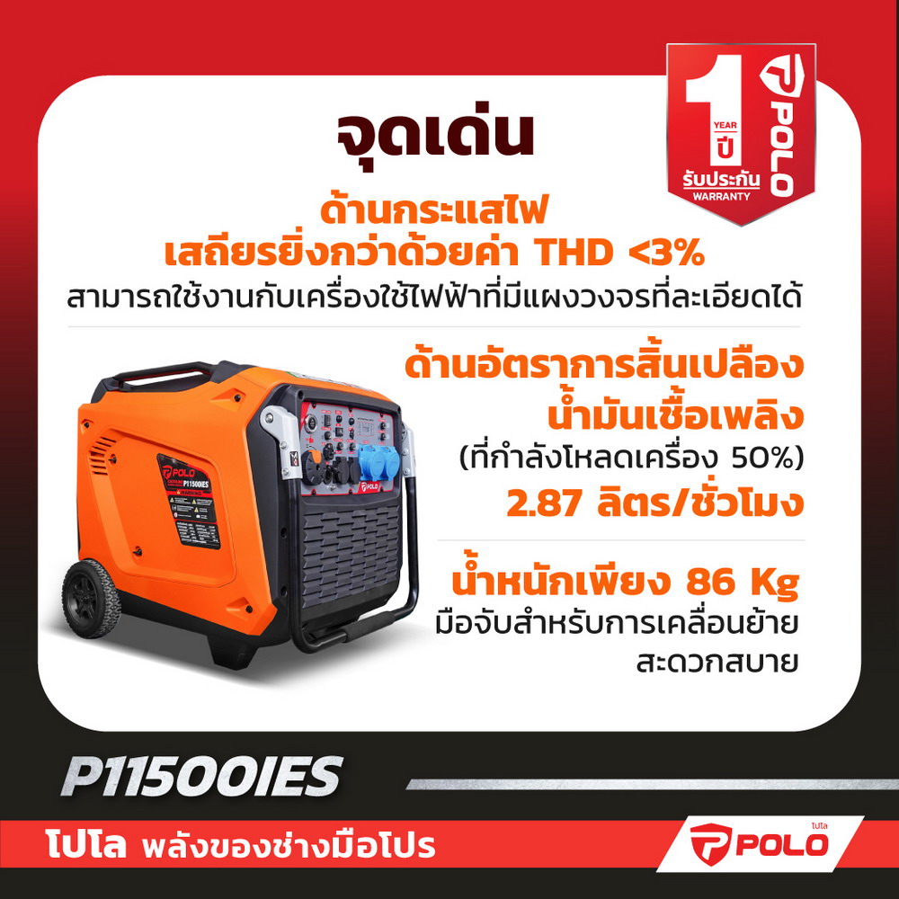 • เครื่องปั่นไฟเบนซินระบบ Inverter POLO รุ่น P11500iES (รุ่นเสียงเงียบ)
