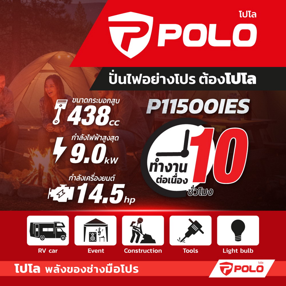 • POLO P11500iES เครื่องปั่นไฟเบนซินระบบ Inverter (รุ่นเสียงเงียบ) 9.5KW กระบอกสูบ 438CC ถังน้ำมัน 30 ลิตร