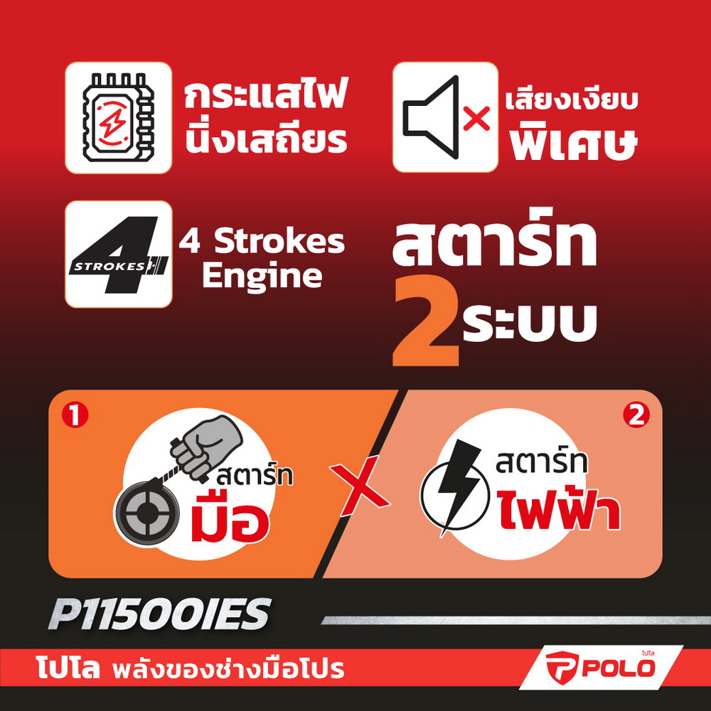 • สตาร์ท 2 ระบบ ด้วยมือดึงและไฟฟ้า ให้กำลังไฟได้ดีกระแสไฟจะนิ่ง