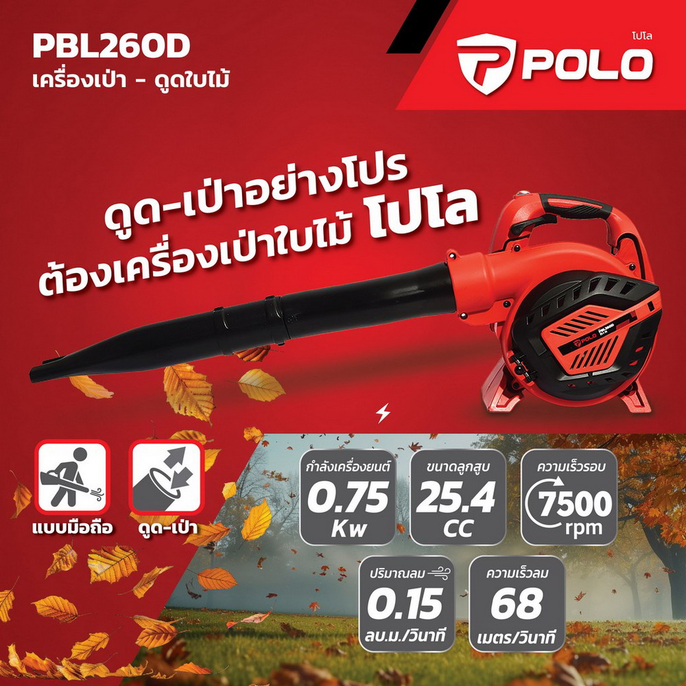 POLO เครื่องเป่าลม-ดูดใบไม้ เครื่องยนต์ 2 จังหวะ 0.75 กิโลวัตต์ รุ่น PBL260D ความเร็วลม 245 กม./ชม. ขนาดลูกสูบ 25.4 ซีซี ถังน้ำมัน 0.45 ลิตร แบบมือถือ
