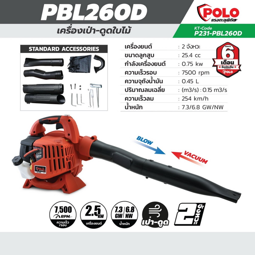 POLO เครื่องเป่าลม-ดูดใบไม้ เครื่องยนต์ 2 จังหวะ 0.75 กิโลวัตต์ รุ่น PBL260D ความเร็วลม 245 กม./ชม. ขนาดลูกสูบ 25.4 ซีซี ถังน้ำมัน 0.45 ลิตร แบบมือถือ