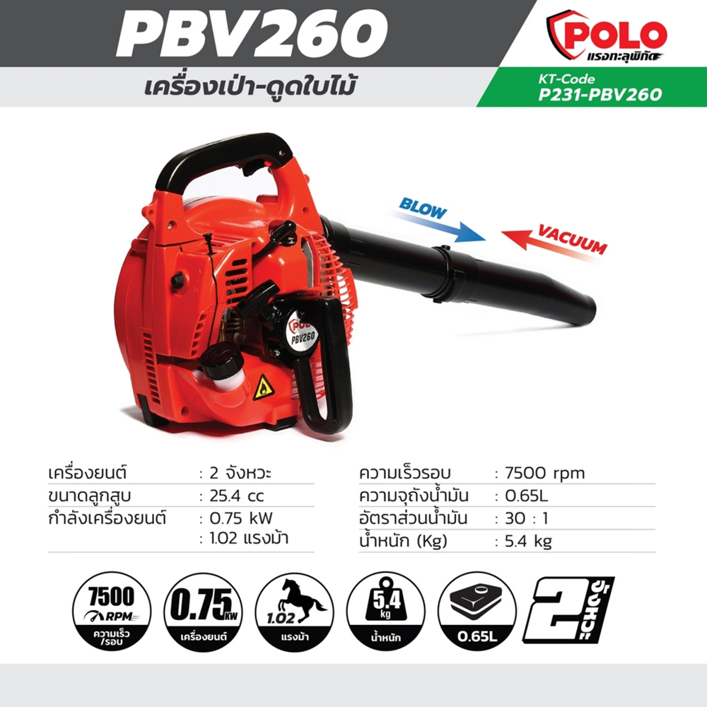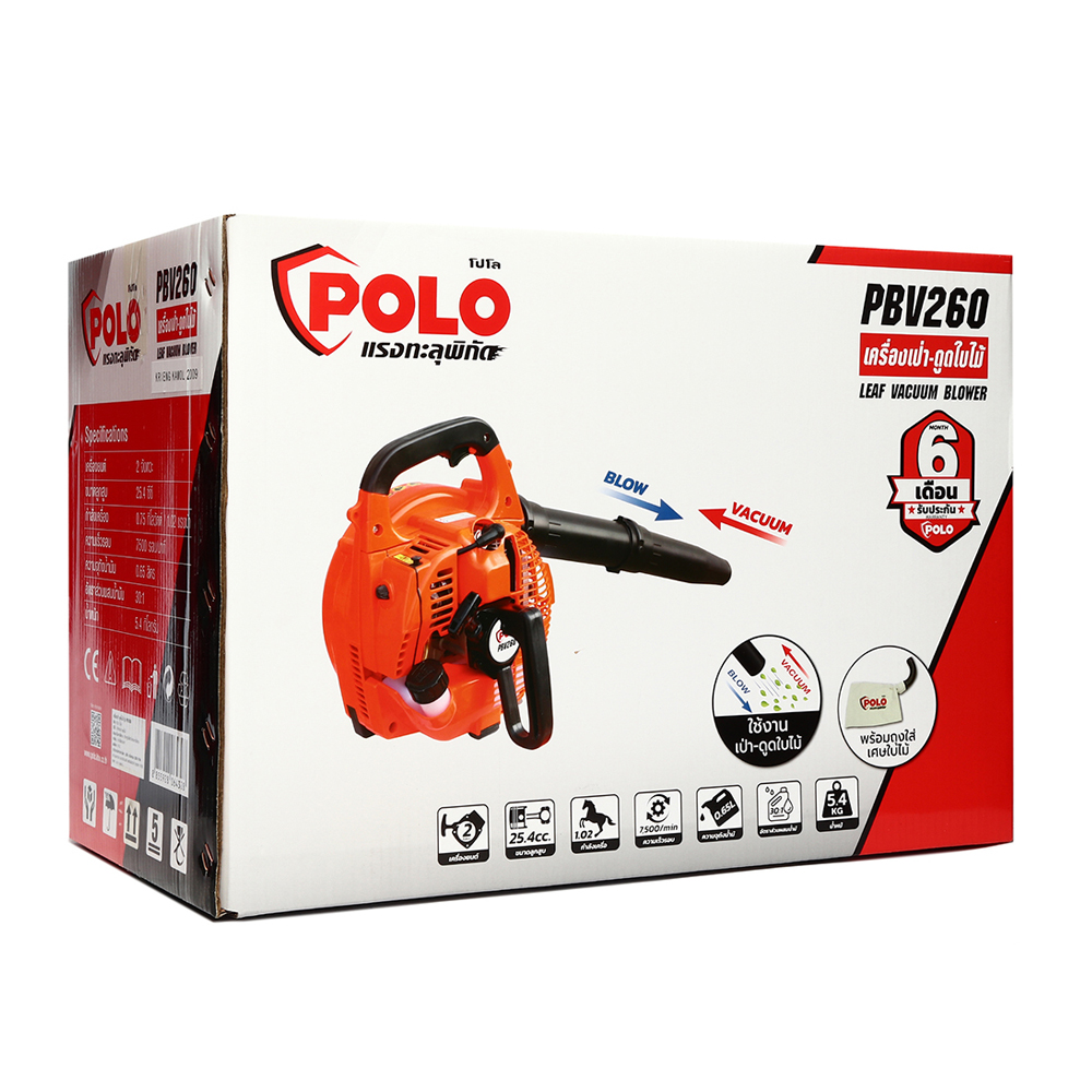 POLO PBV260 เครื่องเป่า-ดูดใบไม้ เครื่องยนต์ 2 จังหวะ ถังน้ำมัน 0.65 ลิตร ลูกสูบ 25.4 CC กำลังเครื่อง 0.75 KW.