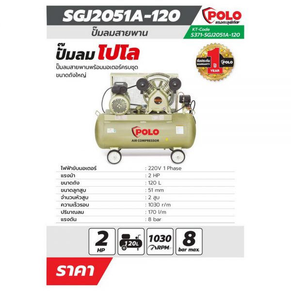 POLO ปั๊มลมสายพาน มอเตอร์ 2 แรงม้า (1500 วัตต์) ถัง 120 ลิตร รุ่น SGJ-2051A-120 ไฟ 1 เฟส ความเร็วรอบ 1030 รอบ/นาที แรงดันลม 8 บาร์ ปริมาณลม 170 ลิตร/นาที