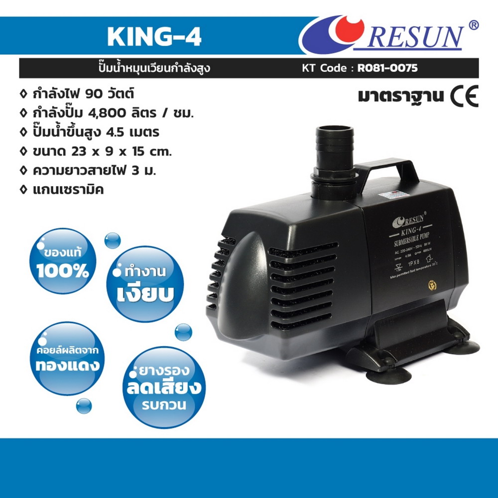 RESUN KING-4 ปั๊มน้ำหมุนเวียนแกนเซรามิค 90W. กำลังปั๊ม 4800 ลิตร/ชม. ปั๊มน้ำสูงสุด 4.5 เมตร
