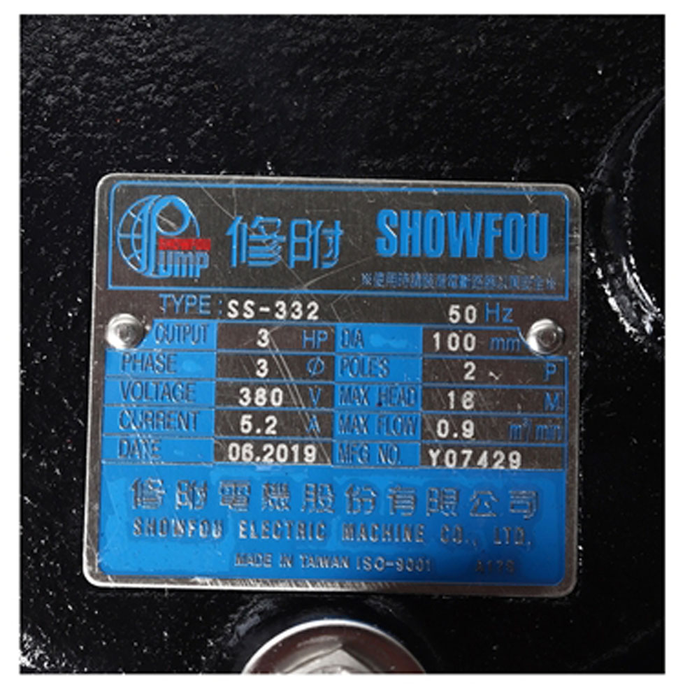 SHOWFOU ปั๊มแช่ใบพัดเปิด รุ่น SS-332D กำลังมอเตอร์ 3 แรงม้า ส่งสูงสุด 18.6 ม. ปริมาณน้ำสูงสุด 800 ลิตร/นาที ท่อส่ง 4 นิ้ว ไฟ 380 โวลต์
