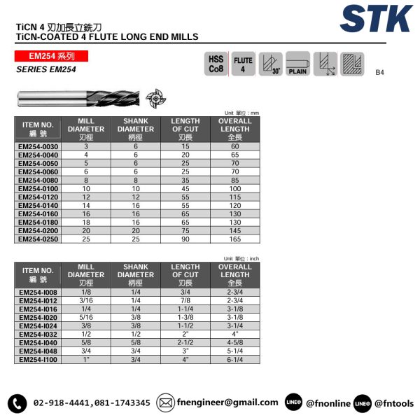 STK EM254-0120 เอ็นมิลรุ่นยาว HSS-CO8 เคลือบ TiCN ขนาด 12x55x115MM. 4Flutes