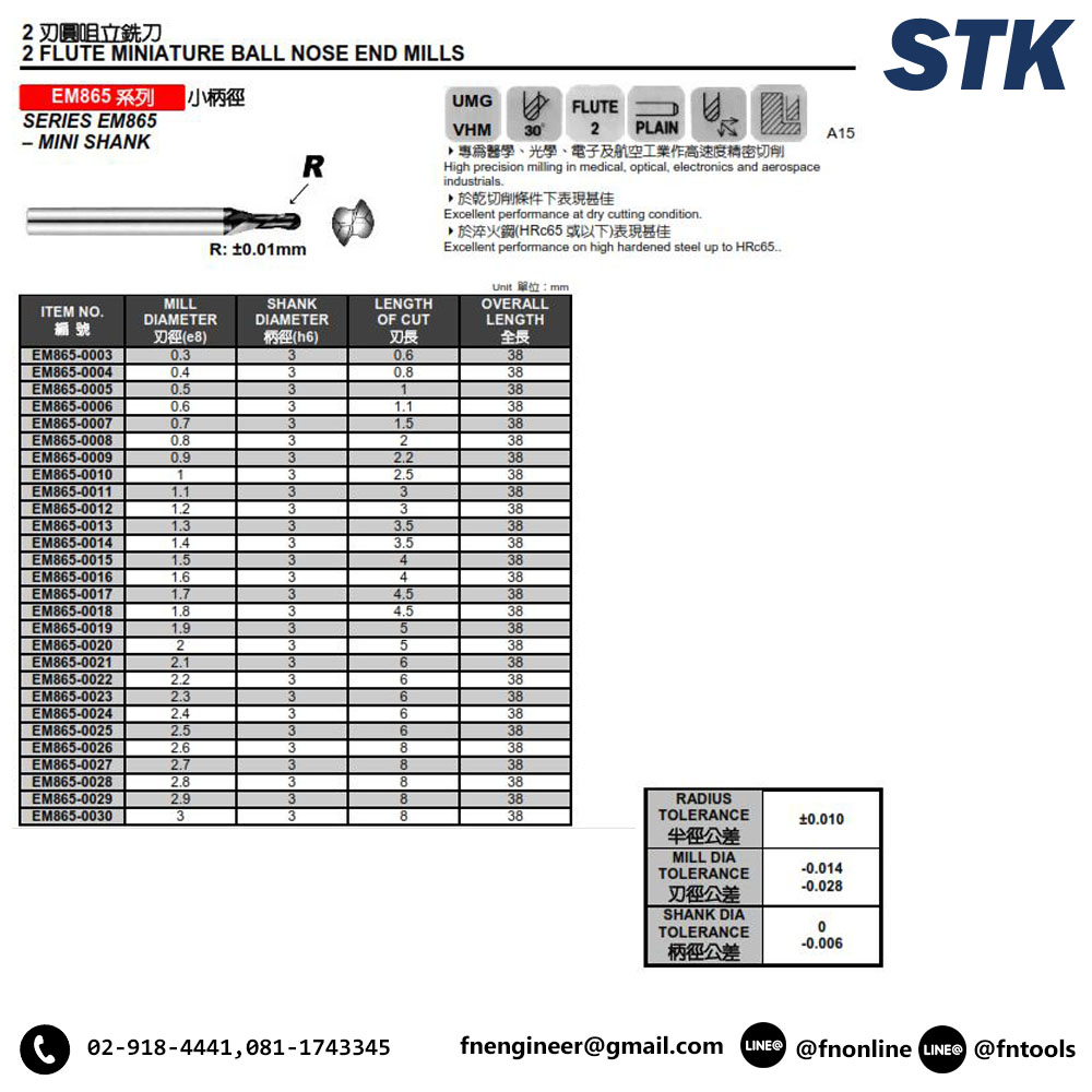 STK EM865 เอ็นมิลคาร์ไบท์หัวมน-แกนเล็ก เคลือบTIALN 2 ฟัน ขนาด 1 MM