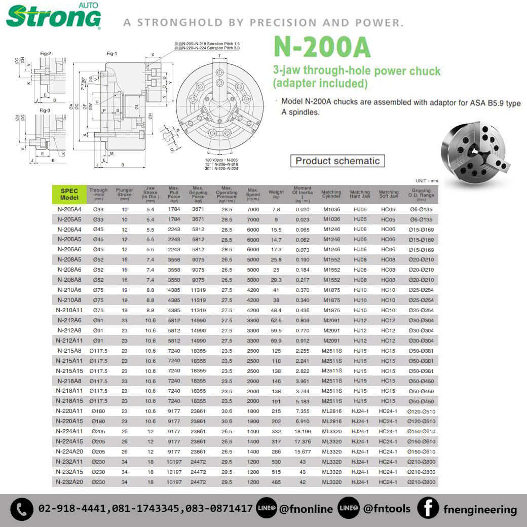• Model N-200A chucks are assembled with adaptor for ASA B5.9 type A spindles.