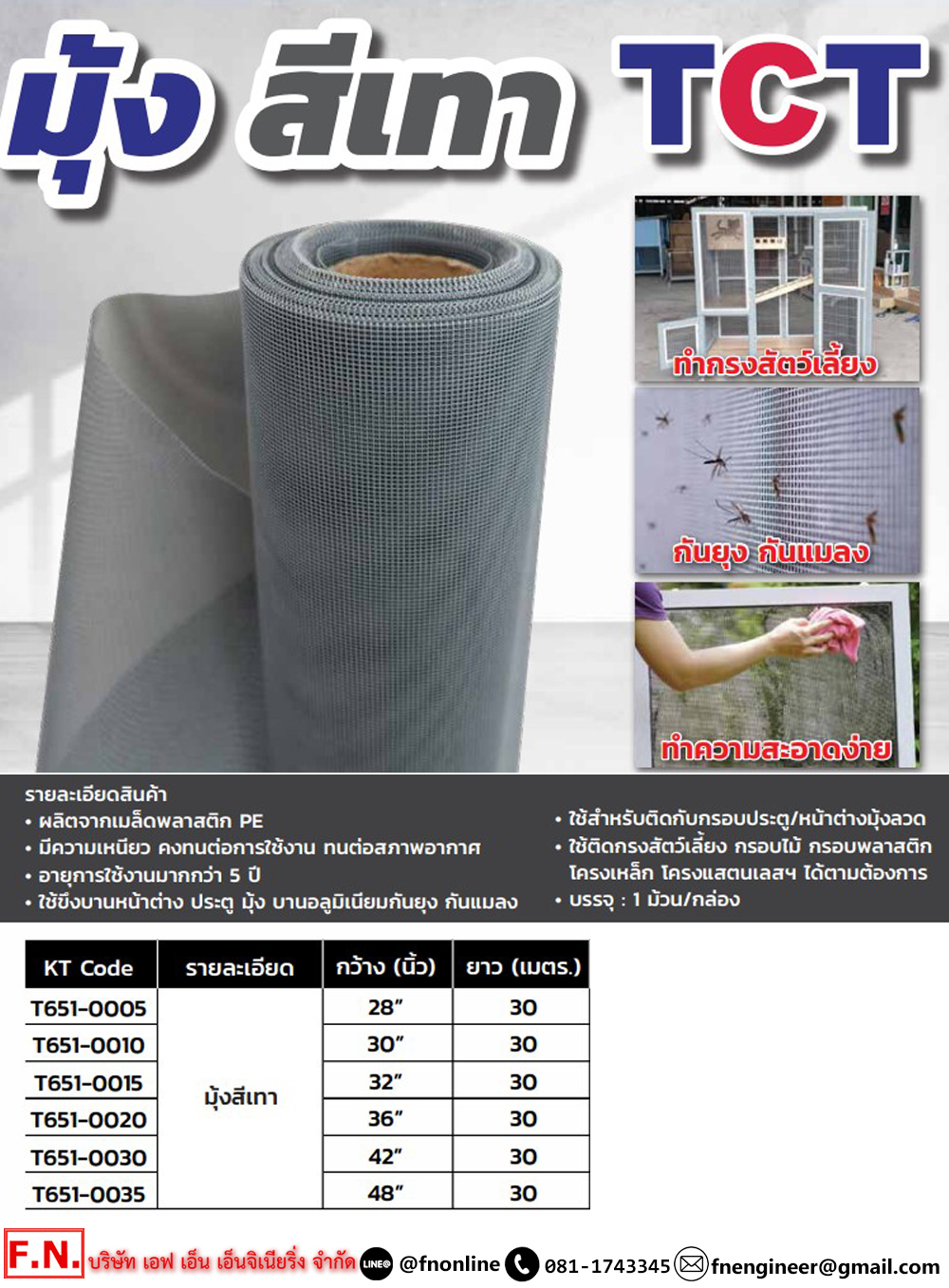 TCT มุ้งหน้าต่างไนล่อนสีเทา ขนาด 30″X 30M. สำหรับใช้ติดกับกรอบประตู/หน้าต่างมุ้งลวด