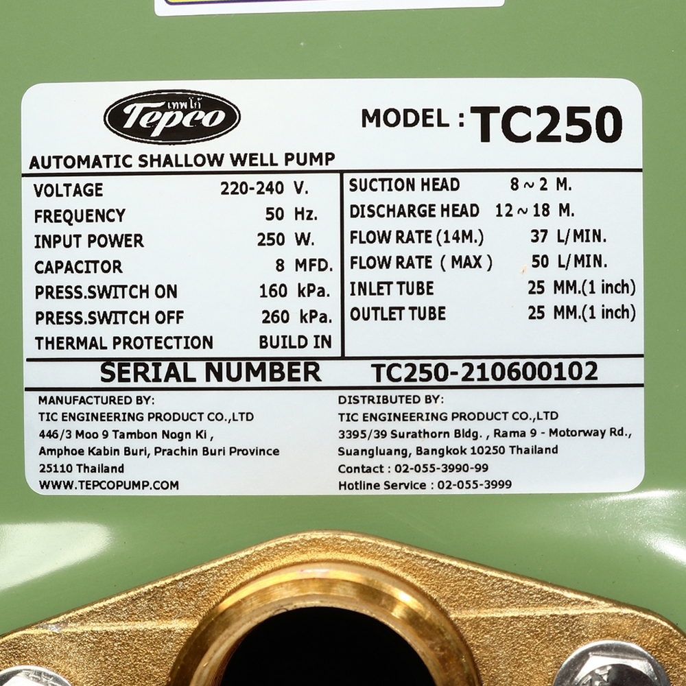 Be the first to review “TEPCO TC250 ปั๊มน้ำอัตโนมัติ ถังกลม 250W. ท่อ 1″ ส่งสูง 50 เมตร ปริมาณน้ำสูงสุด 55 ลิตร/นาที ดูดลึก 8 เมตร”