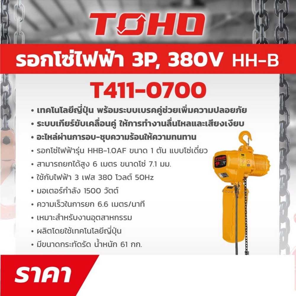 รอกโซ่ไฟฟ้า โตโฮ (TOHO) รุ่น HHB-1.0AF ขนาด 1 ตัน แบบโซ่เดี่ยว กำลังมอเตอร์ 1500 วัตต์ ใช้กับไฟฟ้า 3 เฟส 380 โวลต์ สามารถยกได้สูง 6 เมตร ความเร็วในการยก 6.6 เมตร/นาที