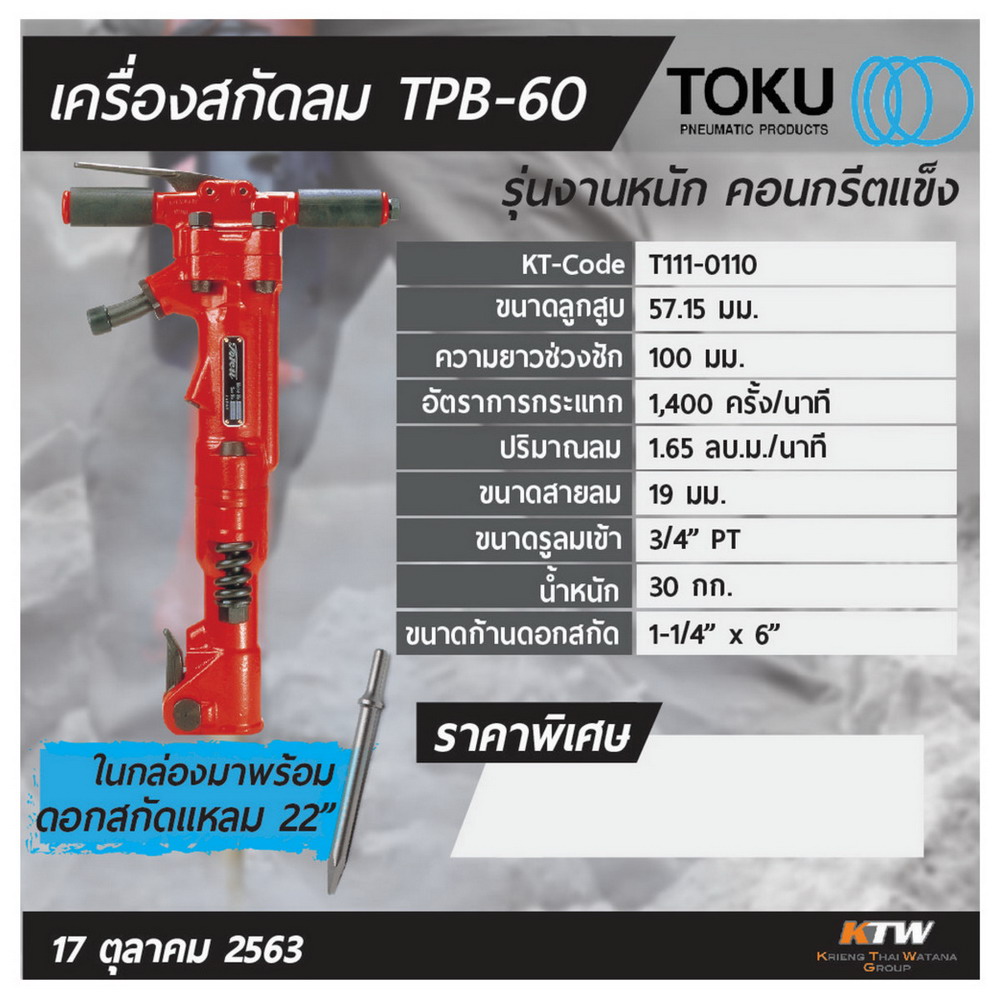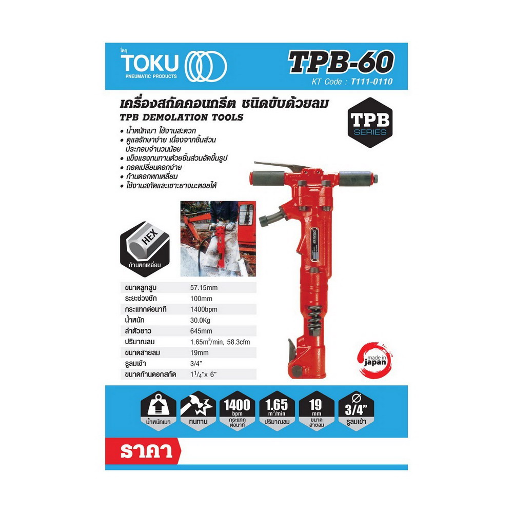 เครื่องสกัดลม โตกุ (TOKU) รุ่น TPB-60 มาพร้อมดอกสกัดแหลมยาว 22 นิ้ว สำหรับงานหนักที่คอนกรีตมีความแข็งสูง มีสลักล๊อกดอกสกัด ทำให้เปลี่ยนดอกได้ง่าย ขนาดลูกสูบ 57.15 มม. ความยาวช่วงชัก 100 มม. ปริมาณลม 1.65 ลูกบาศก์เมตร/นาที (58.3 ลูกบาศก์ฟุต/นาที)