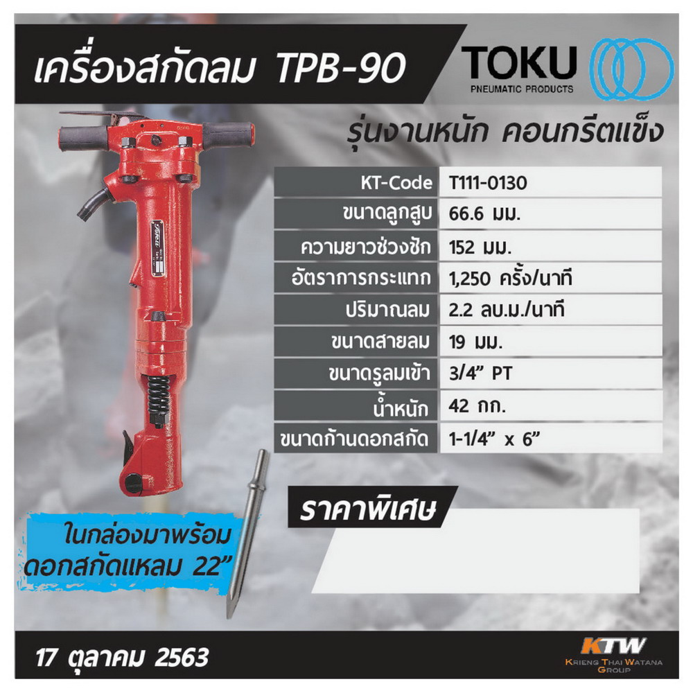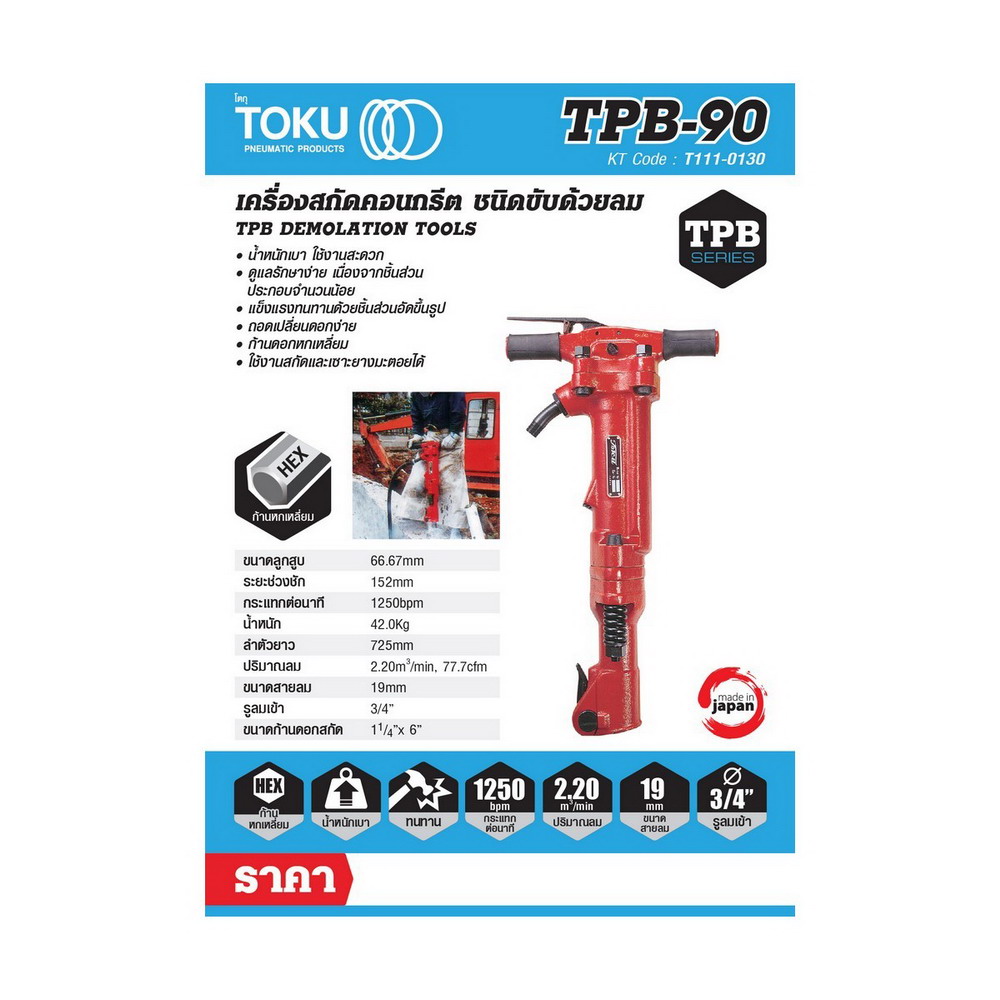 เครื่องสกัดลม โตกุ (TOKU) รุ่น TPB-90 มาพร้อมดอกสกัดแหลมยาว 22 นิ้ว สำหรับงานหนักที่คอนกรีตมีความแข็งสูง มีสลักล๊อกดอกสกัด ทำให้เปลี่ยนดอกได้ง่าย ขนาดลูกสูบ 66.6 มม. ความยาวช่วงชัก 152 มม. ปริมาณลม 2.2 ลูกบาศก์เมตร/นาที (77.7 ลูกบาศก์ฟุต/นาที)
