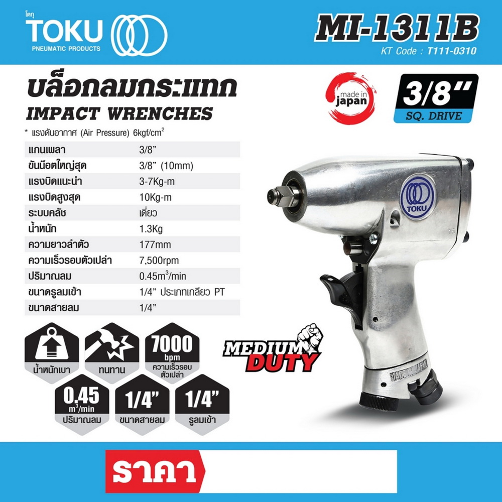 บล๊อกลมกระแทกแบบด้ามปืน โตกุ (TOKU) รุ่น MI-1311B แกนเพลา 3/8 นิ้ว แรงบิดสูงสุด 10 กิโลกรัม-เมตร ระบบคลัชแบบเดี่ยว ปริมาณลม 0.45 ลบ.ม./นาที ขนาดสายลม 1/4 นิ้ว