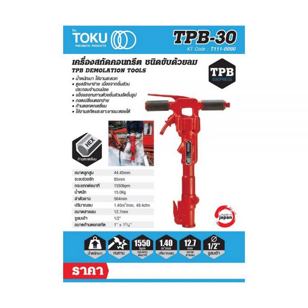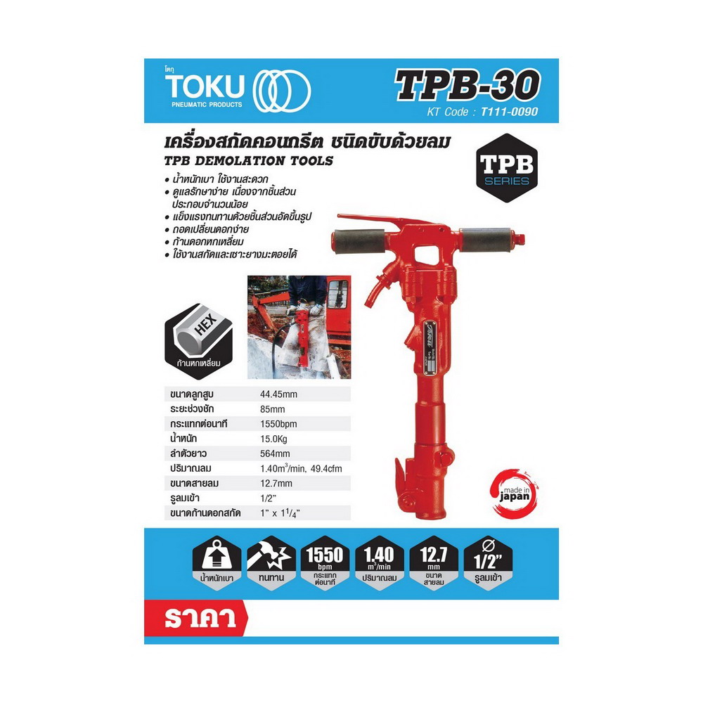 เครื่องสกัดลม โตกุ (TOKU) รุ่น TPB-30 มาพร้อมดอกสกัดแหลมยาว 18 นิ้ว สำหรับงานหนักที่คอนกรีตมีความแข็งสูง มีสลักล๊อกดอกสกัด ทำให้เปลี่ยนดอกได้ง่าย ขนาดลูกสูบ 44.5 มม. ความยาวช่วงชัก 85 มม. ปริมาณลม 1.4 ลูกบาศก์เมตร/นาที (49.4 ลูกบาศก์ฟุต/นาที)