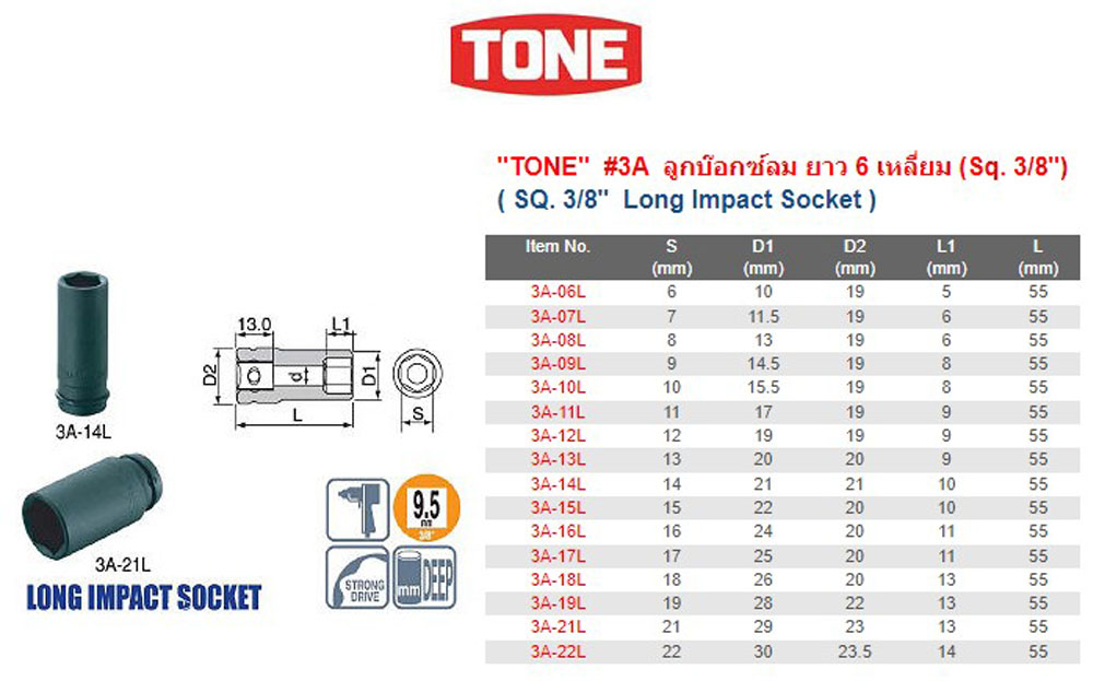 TONE 3A12L ลูกบ๊อกซ์ลมยาว 6 เหลี่ยม 3/8″ ขนาด 12MM.
