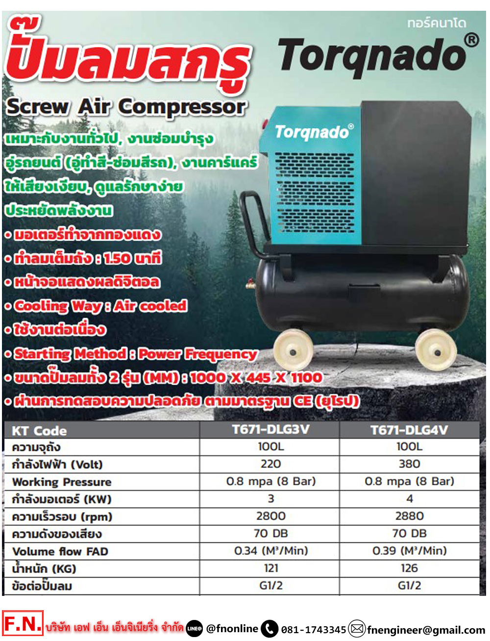 TORQNADO DLG3V ปั๊มลมสกรู 4HP(3KW) 220V. 1เฟส ถัง 100 ลิตร แรงดันลม 8 บาร์