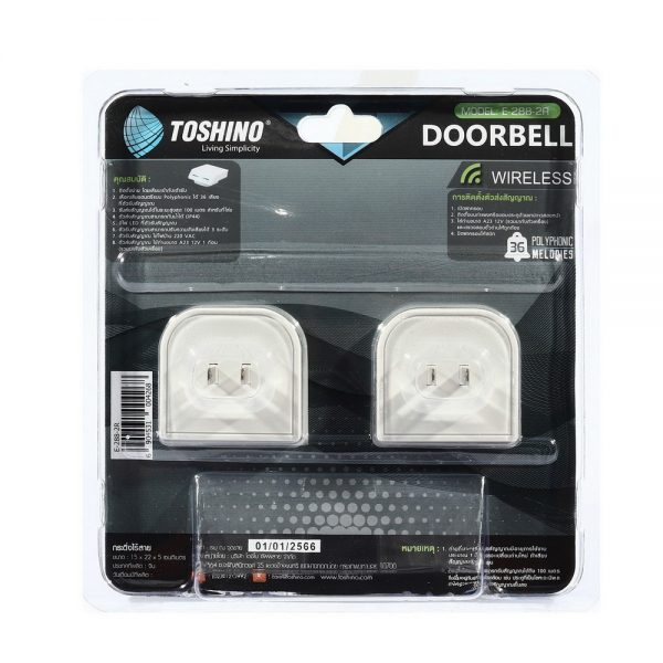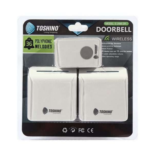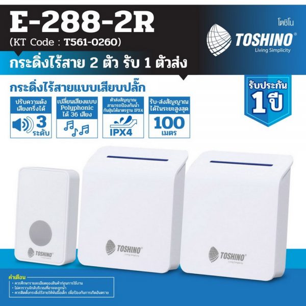 TOSHINO กระดิ่งไร้สาย แบบเสียบปลั๊ก รุ่น E-288-2R สีขาว มี 2 ตัวรับ 1 ตัวส่ง ติดตั้งง่าย รับ-ส่งสัญญาณได้สูงสุด 100 เมตร เปลี่ยนเสียงได้ 36 เสียง มาตรฐาน IPX4