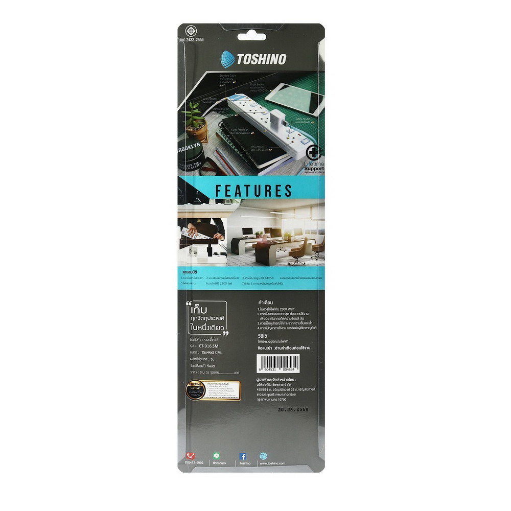 • รางปลั๊กไฟ TOSHINO ปลั๊กพ่วง 6 สวิตช์ 6 ช่อง สายไฟยาว 5 เมตร รุ่น ET-9165M มาตรฐาน มอก. รองรับไฟ 2300 วัตต์ 10 แอมป์ มีระบบป้องกันไฟกระชาก
