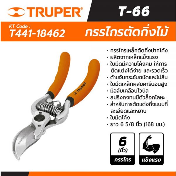 TRUPER 18462 กรรไกรเหล็กตัดกิ่งไม้ปากโค้ง 6 นิ้ว รุ่น T-66 สำหรับการตัดแต่งกิ่งที่ละอียด และหยาบ (ทรูเปอร์)