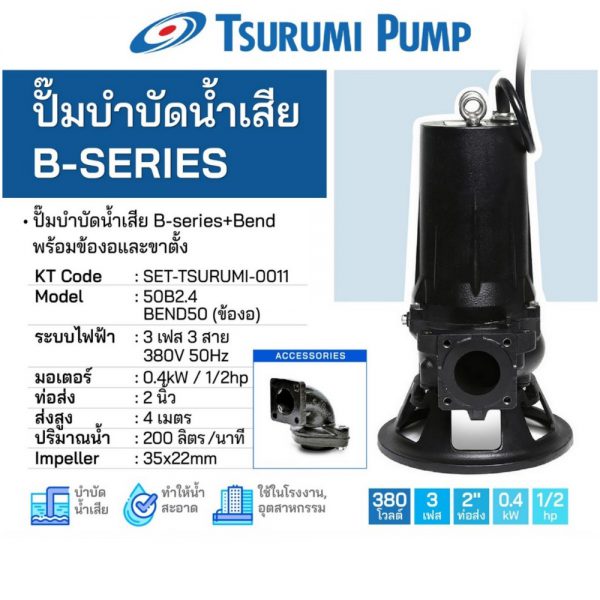 TSURUMI 50B2.4 ชุดปั๊ม พร้อมข้องอ ขนาด 0.5HP 380V ท่อส่ง 2 นิ้ว