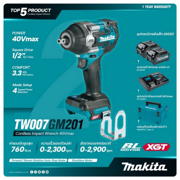 • เครื่องขันบล๊อกไร้สาย 40 โวลต์ MAKITA รุ่น TW007GM201 (รวมแบตเตอรี่และแท่นชาร์จ)