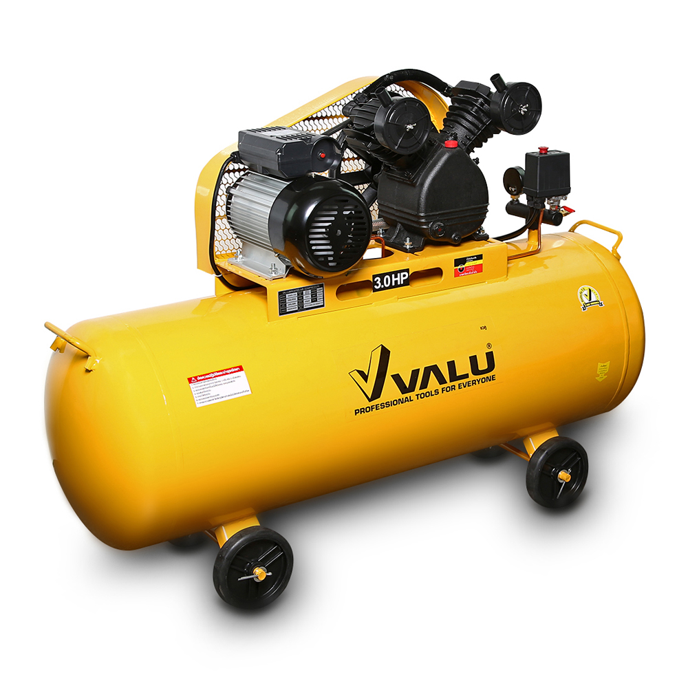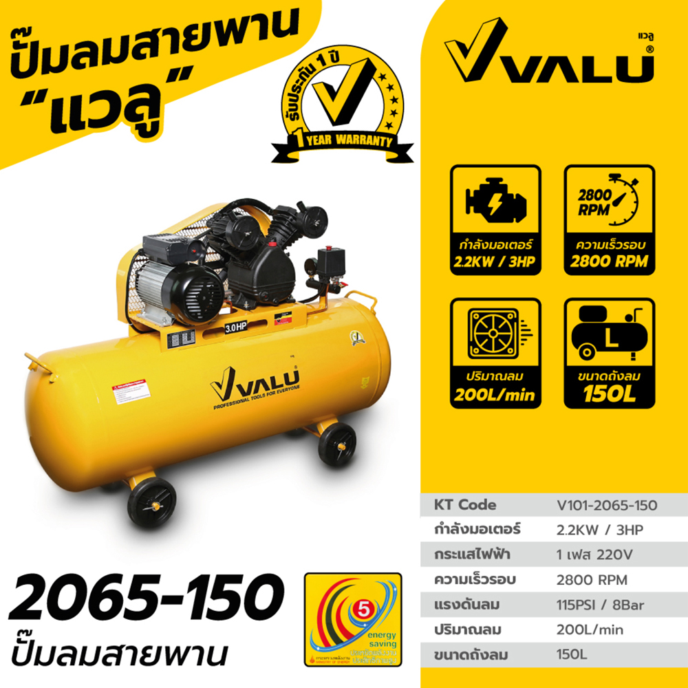 ปั๊มลมสายพาน แวลู (VALU) รุ่น 2065-150 กำลังมอเตอร์ 3 แรงม้า (2237 วัตต์) ขนาดถังลม 200 ลิตร แรงดัน 8 บาร์ ปริมาณลม 200 ลิตร/นาที