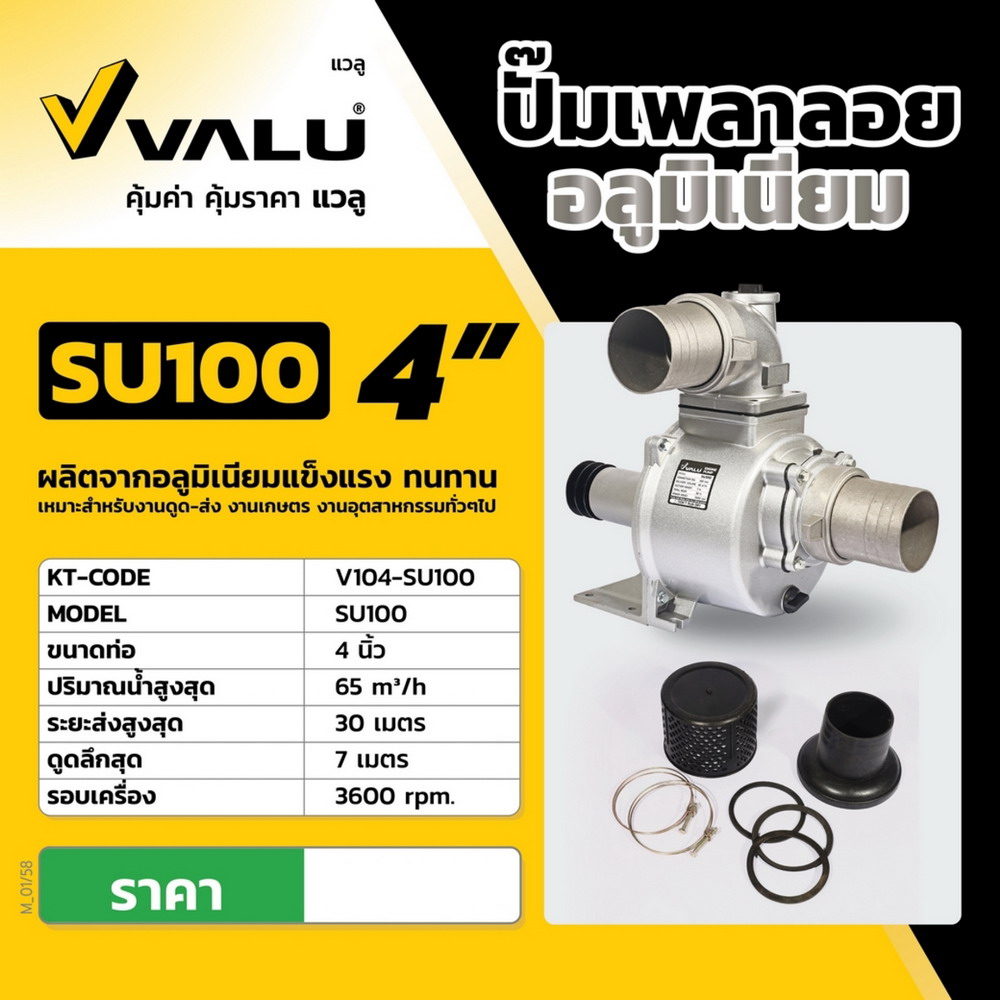 • VALU SU100 ปั๊มเพลาลอยอลูมิเนียม ท่อ 4 นิ้ว ส่งสูง 30 เมตร ปริมาณน้ำ 65 ลบ.ม./ชม.