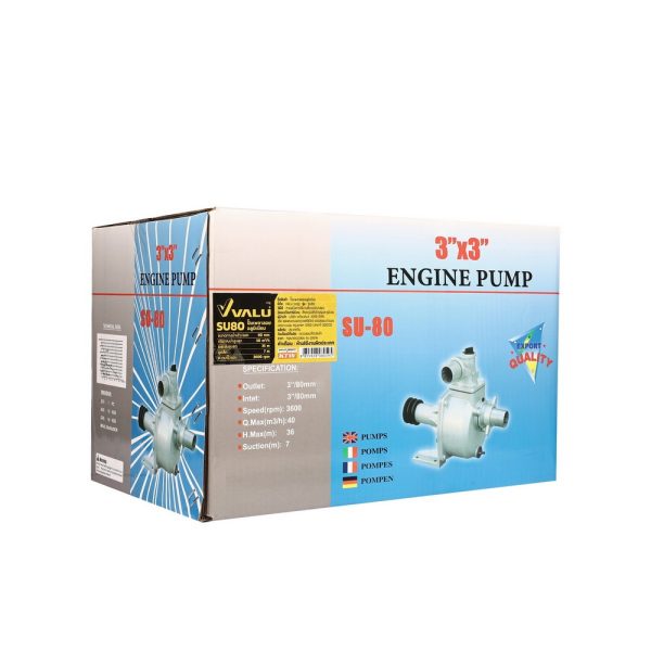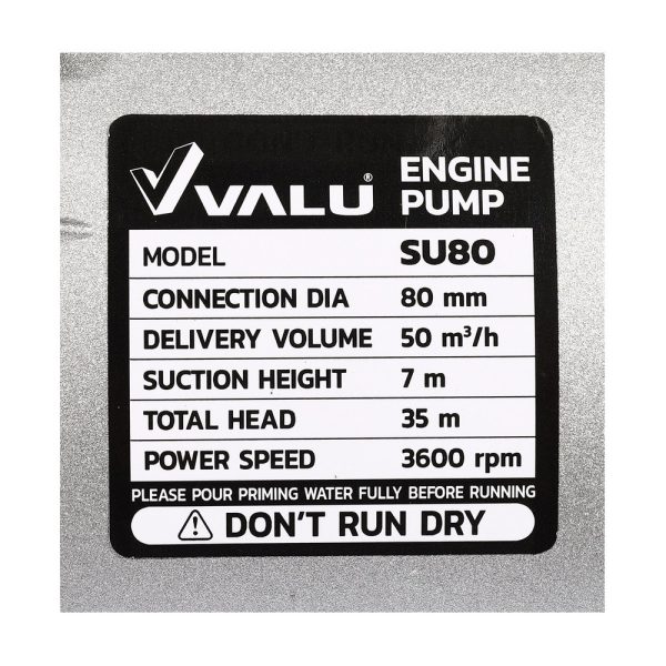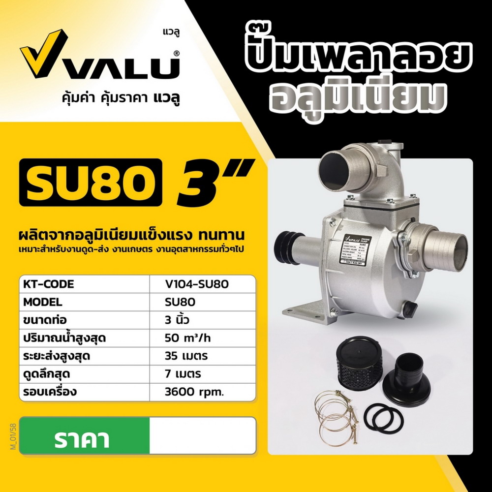 VALU ปั๊มเพลาลอยอลูมิเนียม ท่อ 3 นิ้ว รุ่น SU80 ส่งสูง 35 เมตร ปริมาณน้ำ 50 ลบ.ม./ชม. ความเร็วรอบ 3600 รอบ/นาที