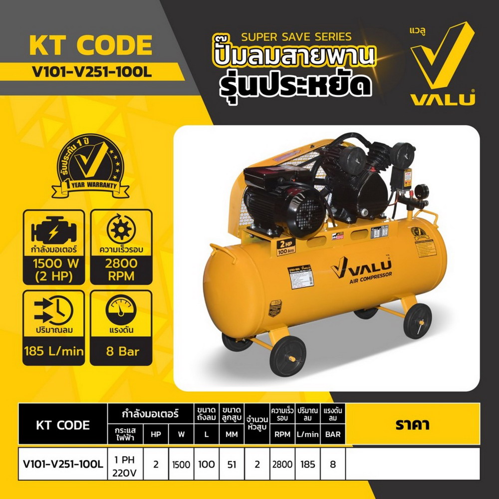 VALU ปั๊มลมสายพาน 2 หัว รุ่น 251-100 มอเตอร์ 2 แรงม้า (1500 วัตต์) ถัง 100 ลิตร ไฟ 1 เฟส ความเร็วรอบ 2800 รอบ/นาที แรงดันลม 8 บาร์ ปริมาณลม 185 ลิตร/นาที