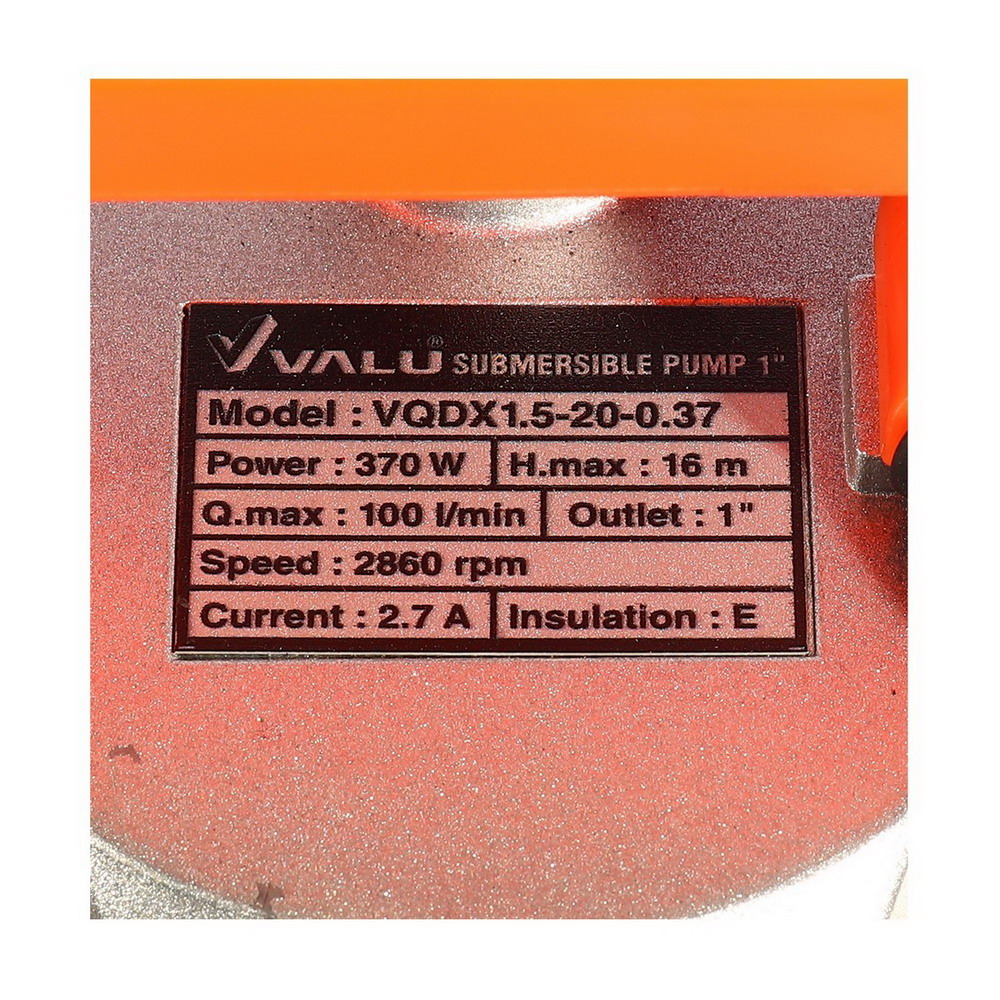 VALU ปั๊มแช่อลูมิเนียม 370 วัตต์ 220 โวลต์ ท่อ 1 นิ้ว รุ่น VQDX1.5-20-0.37 ส่งสูง 16 เมตร ปริมาณน้ำ 100 ลิตร/นาที สายไฟยาว 8 เมตร