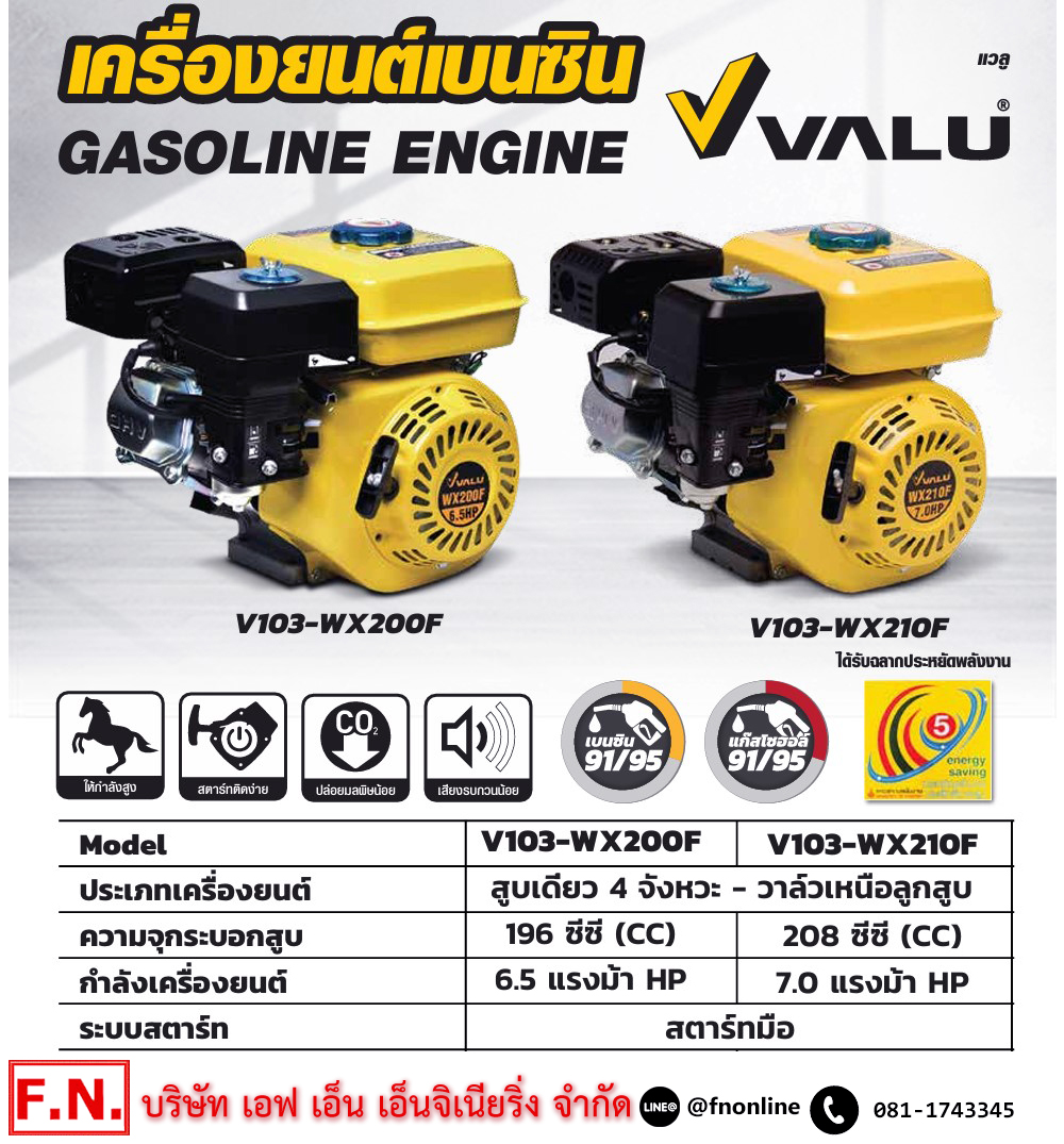 VALU เครื่องยนต์เบนซิน รุ่น WX200F กำลังเครื่องยนต์ 6.5 แรงม้า สูบเดี่ยว 4 จังหวะ ความจุกระบอกสูบ 196 ซีซี ถังน้ำมัน 3.6 ลิตร