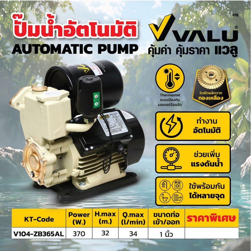VALU ปั๊มน้ำออโต้ 370 วัตต์ รุ่น ZB-365AL กำลังมอเตอร์ 0.5 แรงม้า ขนาดท่อเข้าและออก 1 นิ้ว ส่งสูง 32 เมตร อัตราการไหล 34 ลิตร/นาที พร้อมฐาน