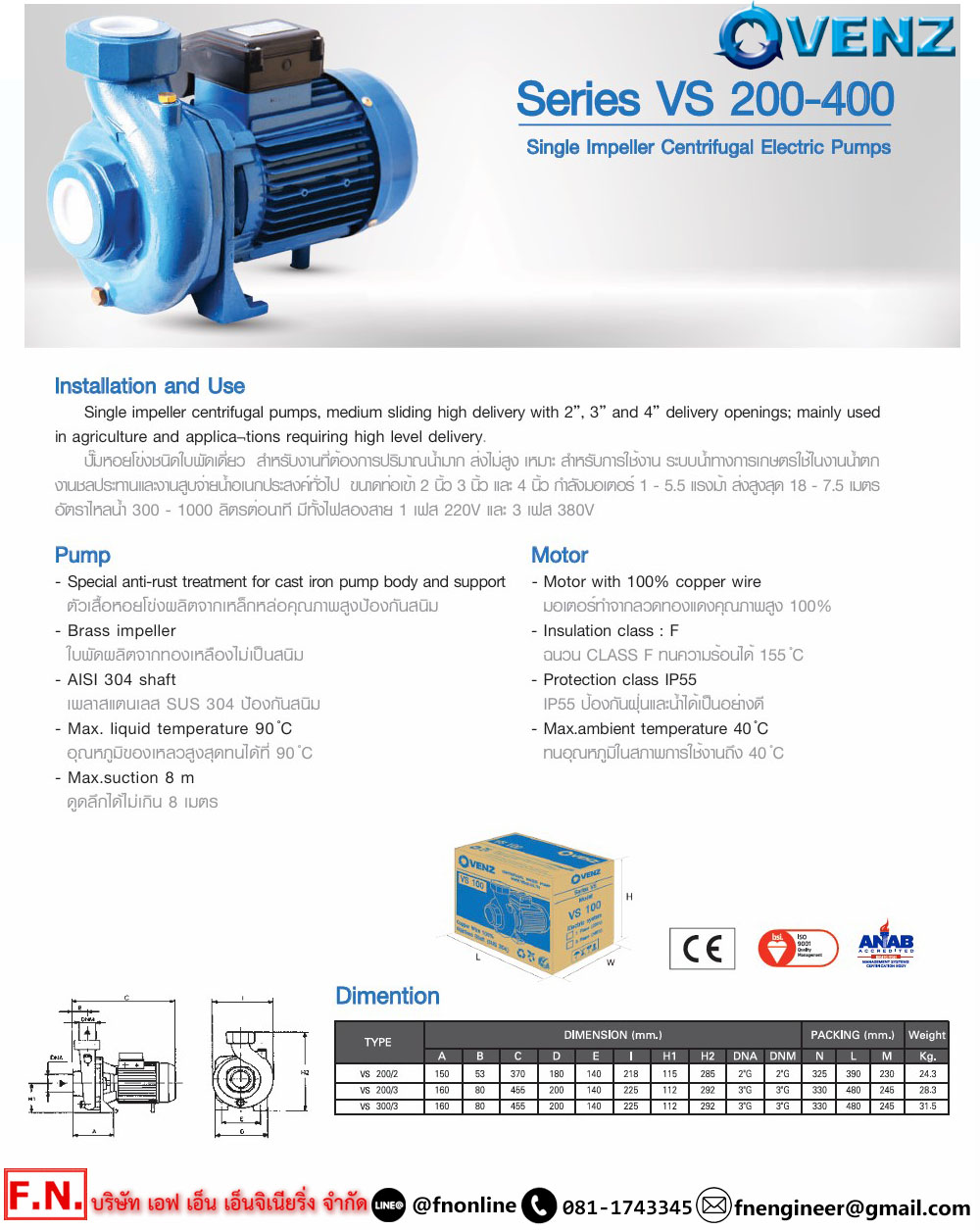 • ฉนวน CLASS F สามารถทนความร้อนได้ 155°c ทำให้มอเตอร์มีอายุการใช้งานที่ยาวนานขึ้น