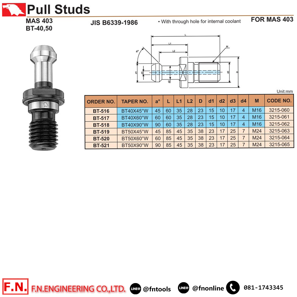 VERTEX BT-516 พูลสตัด สำหรับด้าม BT40X45˚W (มีรูน้ำ)