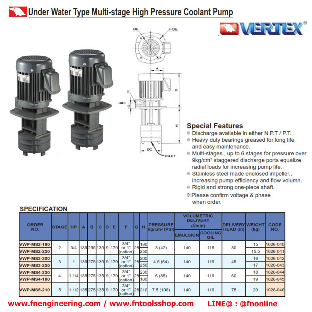 VERTEX VWP-MS2-250 คูลแลนท์ปั้มแรงดันสูง 3/4HP 380V (ความสูง 250 มิล)
