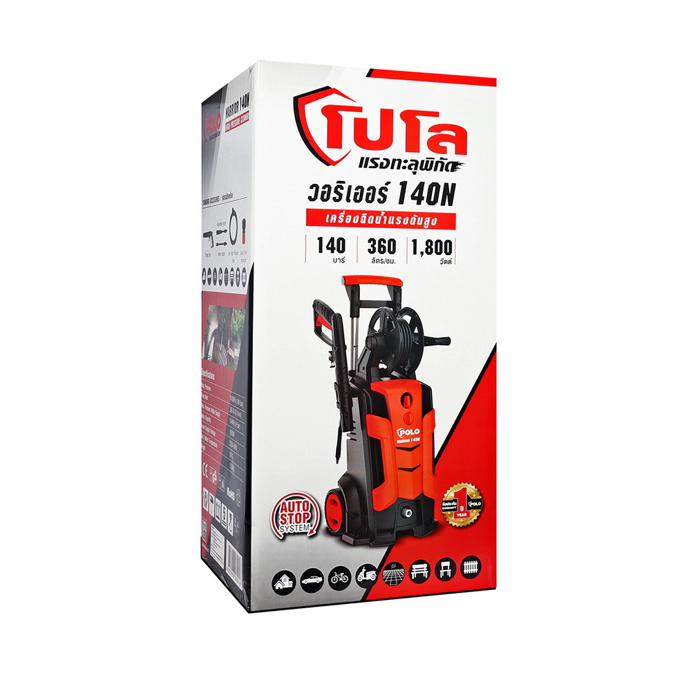 POLO เครื่องฉีดน้ำแรงดันสูง 1800 วัตต์ แรงดัน 140 บาร์ รุ่น WARRIOR-140N อัตราการฉีด 360 ลิตร/ชม. สายยาว 5 ม. มอเตอร์แปรงถ่าน มีระบบ Auto Stop