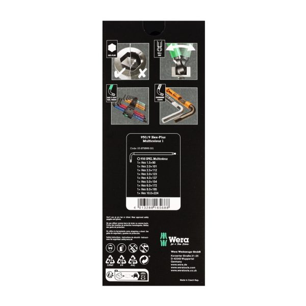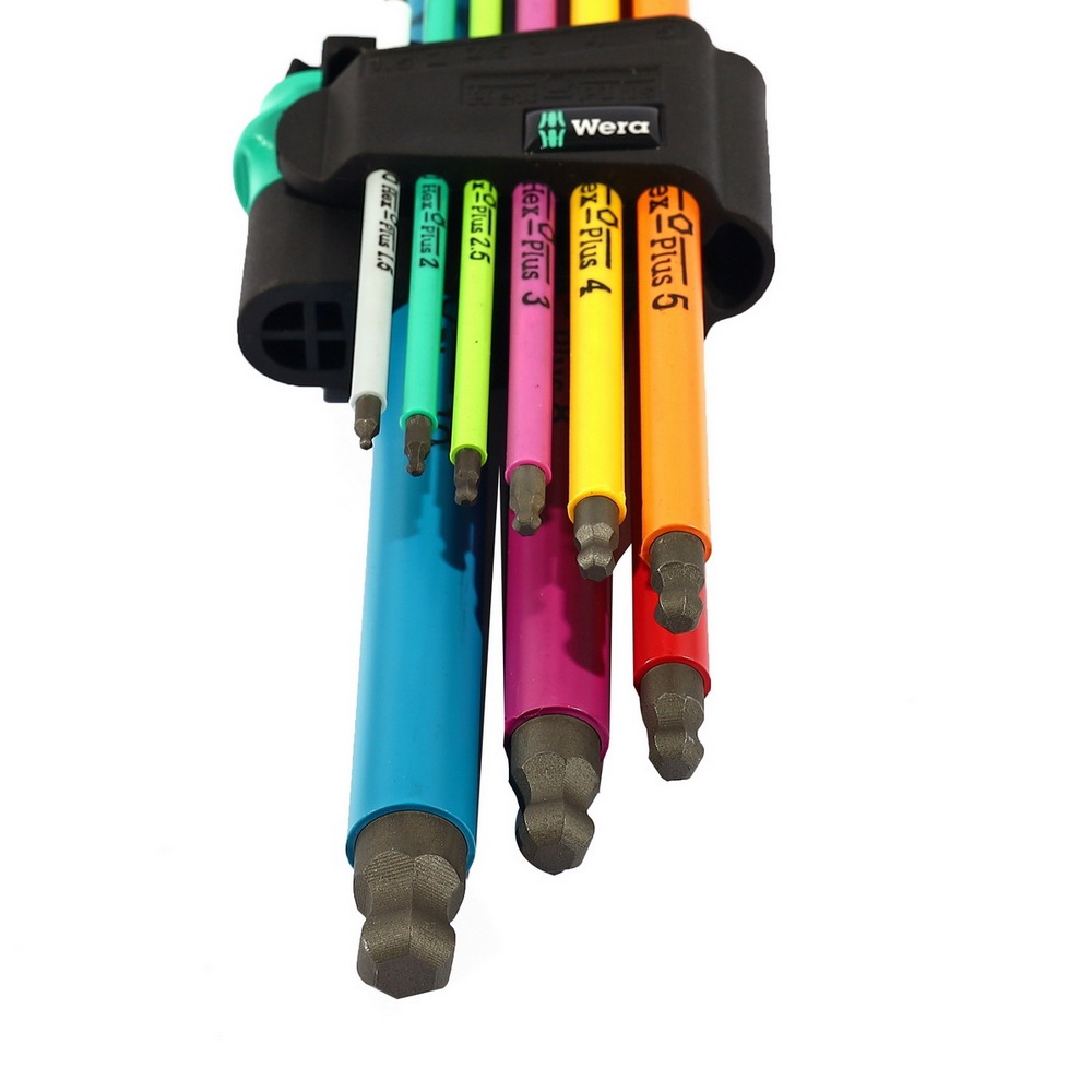 • ชุดประแจหกเหลี่ยมเมตริกจำนวน 9 ชิ้น หรือที่เรียกว่าประแจอัลเลน ประแจหกเหลี่ยมเหล่านี้ออกแบบโดยใช้โปรไฟล์ Hex-Plus ที่ได้รับการจดสิทธิบัตรของ Wera ซึ่งมีพื้นผิวสัมผัสที่ใหญ่กว่าบนหัวสกรูเพื่อป้องกันการปัดเศษ