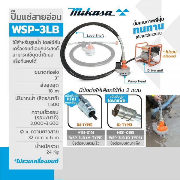 MIKASA ปั๊มแช่สายอ่อน ขนาดท่อน้ำออก 3 นิ้ว (76 มม.) รุ่น WSP-3LB สายยาว 6 เมตร มาพร้อมข้อต่อแบบ GM (สวมเร็ว) สูบน้ำสูงสุด 18 เมตร อัตราการไหล 1,200 ลิตร/นาที