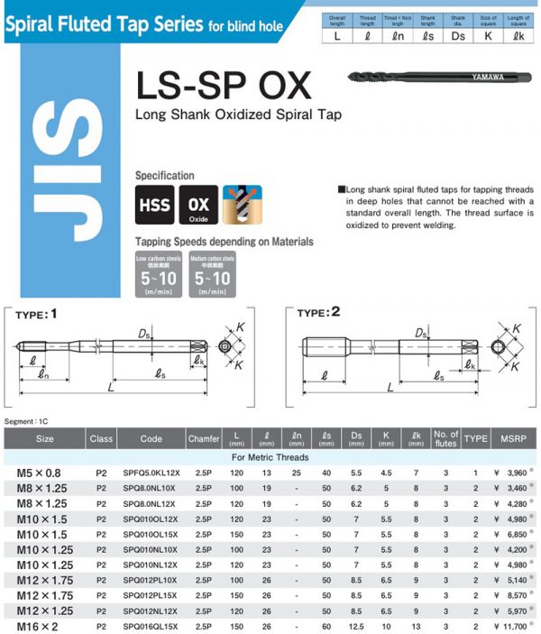 • YAMAWA LS-HC-SP ต๊าปเกลียวสว่าน ก้านยาว M6X1.0X L100 P2 สำหรับต๊าปเกลียวในรูลึก