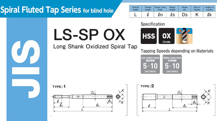 • Flute type SP(Long Spiral Fluted Taps for blind hole)